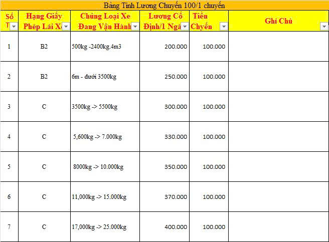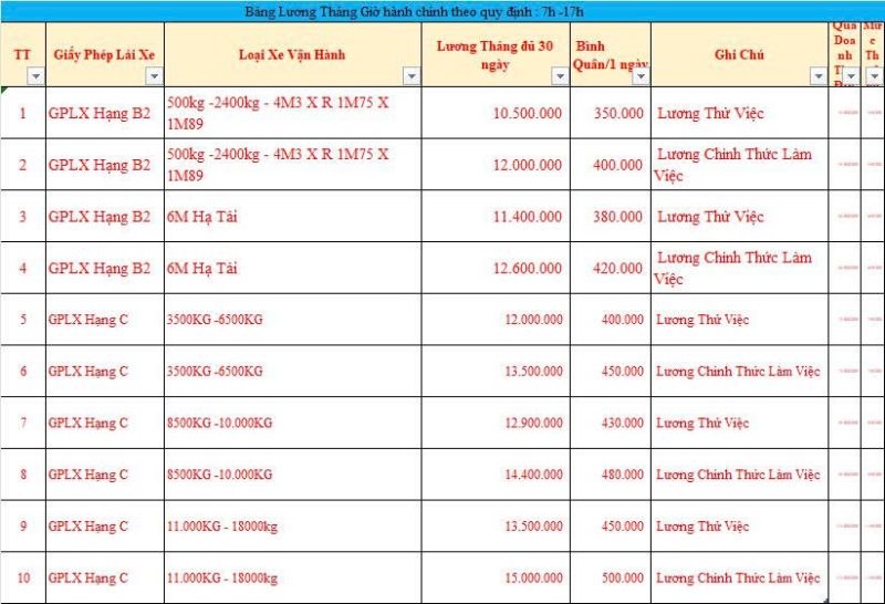 Dưới đây là bảng tổng hợp chi tiết về chế độ lương và phụ cấp dành cho tài xế của Công ty Lâm Sang dựa