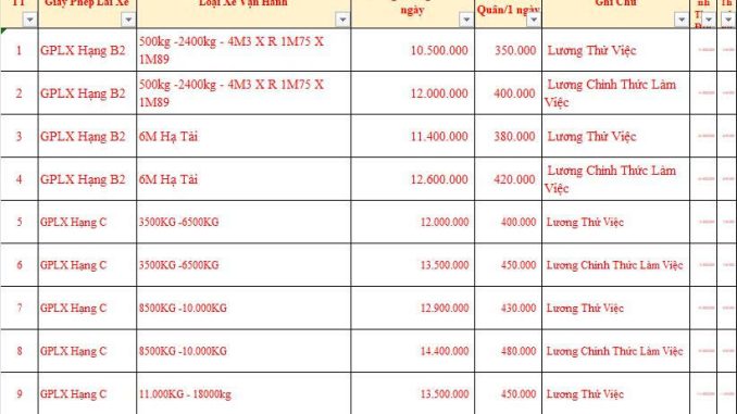 Mức lương được phân chia dựa trên hạng Giấy phép lái xe (GPLX), tải trọng xe và giai đoạn làm việc (Thử việc/Chính thức):