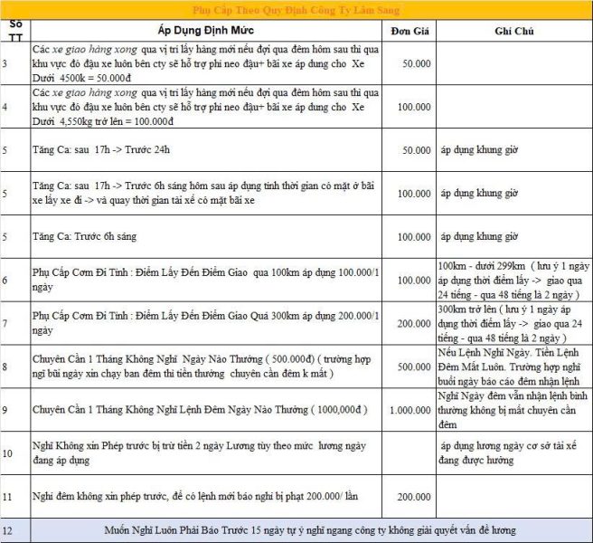 CHẾ ĐỘ LƯƠNG VÀ PHỤ CẤP CÔNG TY VẬN TẢI LÂM SANG