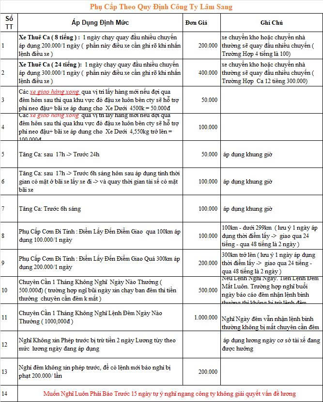 Dựa trên hình ảnh bảng tính lương và quy định phụ cấp của Công ty Lâm Sang mà bạn cung cấp, tôi đã hệ thống lại thành một bài viết chi tiết, rõ ràng để tài xế hoặc nhân viên mới có thể dễ dàng nắm bắt quyền lợi và trách nhiệm của mình.